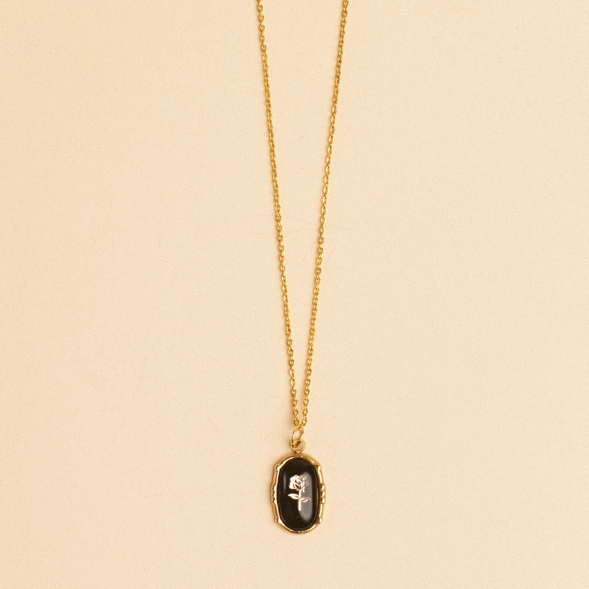 A study in contrast, the Cleo Necklace captures shadow in motion. Its deep stone and gold framing create a silhouette both bold and serene — a quiet companion for those drawn to depth.